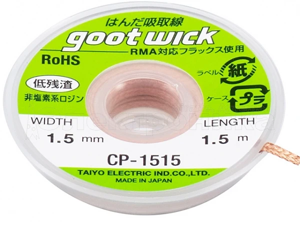 Высококачественная медная оплетка профлюсована флюсом класса «RMA». Особотонкое плетение. Обеспечивает деликатное удаление припоя при выпаивании радиокомпонентов на печатных платах. Рекомендации к применению: Приложить оплетку к месту, где требуется удалить припой, и сверху поднести жало паяльника. В процессе нагрева припой впитывается в оплетку за счет капиллярного эффекта. После выполнения работ необходимо отрезать насыщенную припоем часть оплетки. Диаметр: 1,5 мм Длина: 1,5 м Вес: 11 г