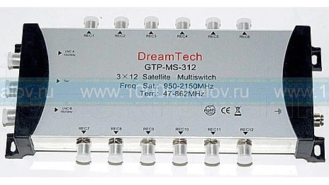 Мультисвитчер DreamTech GTP-MS-312 ; GTP-MS-312 PS отличие - только наличие встроенного блока питания у GTP-MS-312 PS 2*SAT/1*TV вход, 12 независимых выходов, SAT+TV 47..862/950..2150МГц DREAMTECH GTP-MS-312 - характеристики НАЗНАЧЕНИЕ GTP-MS-312 Тип: Мультисвитч SAT входов: 2; ТВ вход: 1; Количество независимых выходов: 12; Частотный диапазон: 47..862/ 950..2150 МГц; Питание: от внешнего блока питания (опция). Другие наименования модели: DreamTech GTP MS 312